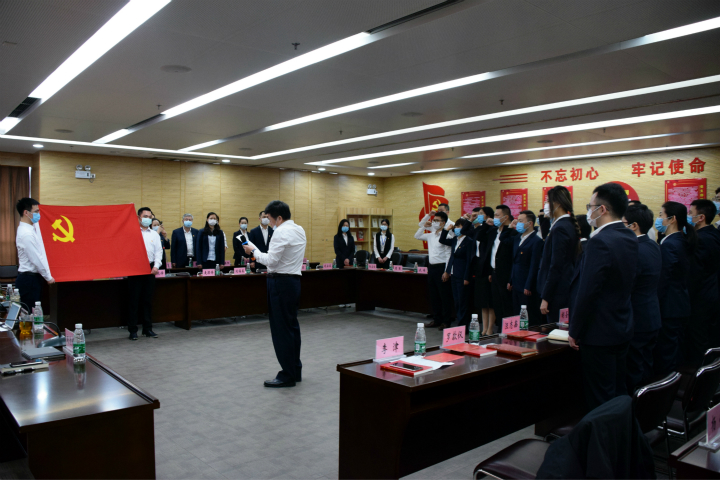 入党宣誓仪式在雄壮的《国际歌》声中正式开始。集团提前制作视频资料片,逐一介绍新党员同志,列明入党时间。随后,由赵光南同志领誓,党员同志们面对党旗庄严宣誓,铿锵有力,表达出决心,表现出真心。