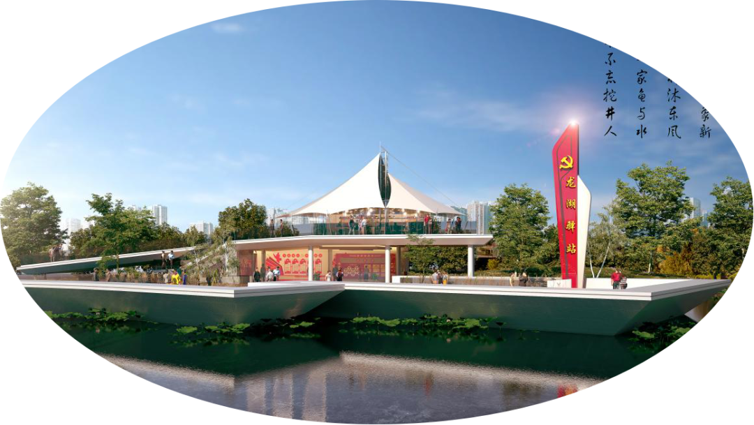 利用跃龙台廊底空间,采用玻璃幕墙的形势围合,在一层建设一个便民服务厅,配套周边湖景、栈道等景观,将驿站打造成为一艘准备起航的船型建筑,寓意黄埔区广州开发区敢为人先,勇于乘风破浪的精神,该船型建筑停泊在湖面,与周边广场连为一体,又有党群鱼水相依等寓意。