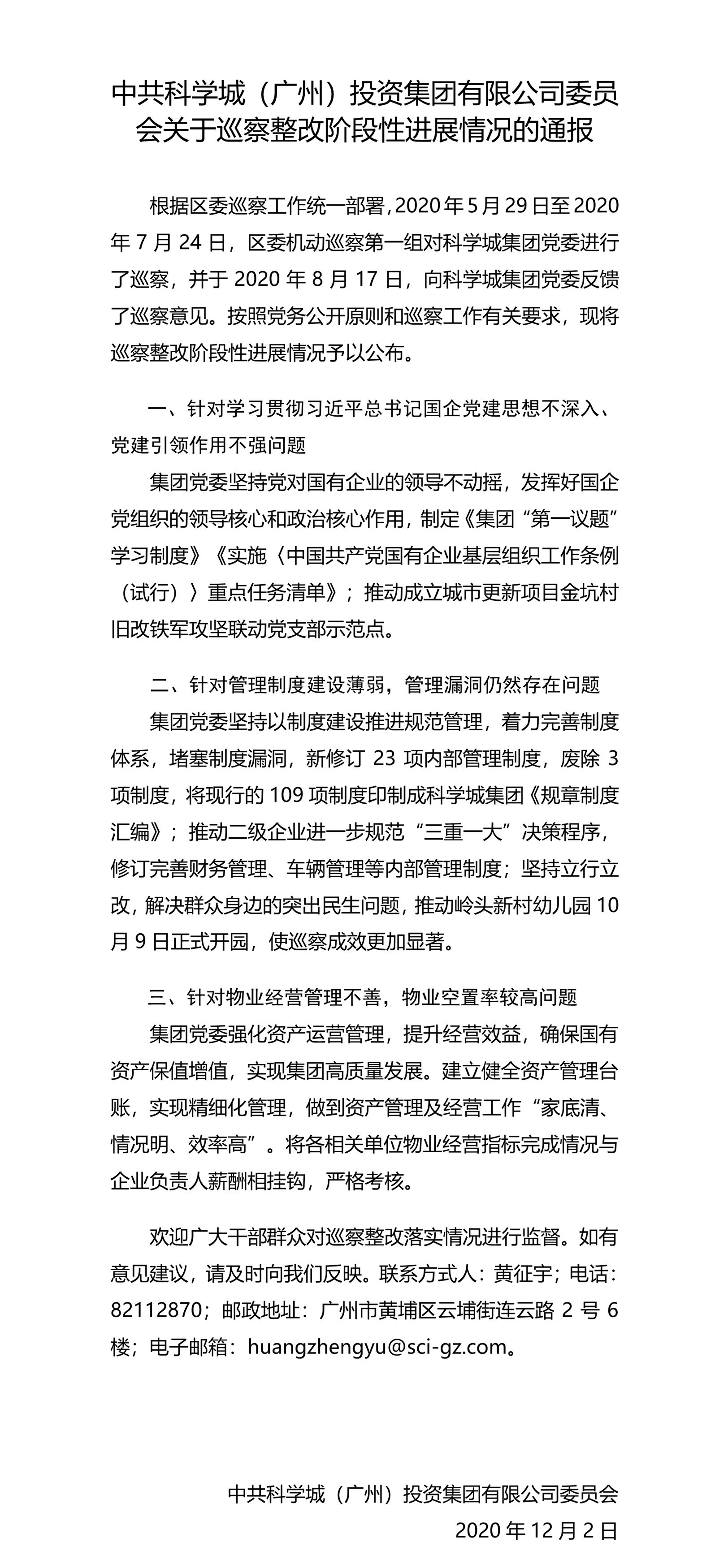 中共888集团welcome大厅(广州)投资集团有限公司委员会关于巡察整改阶段性进展情况的通报